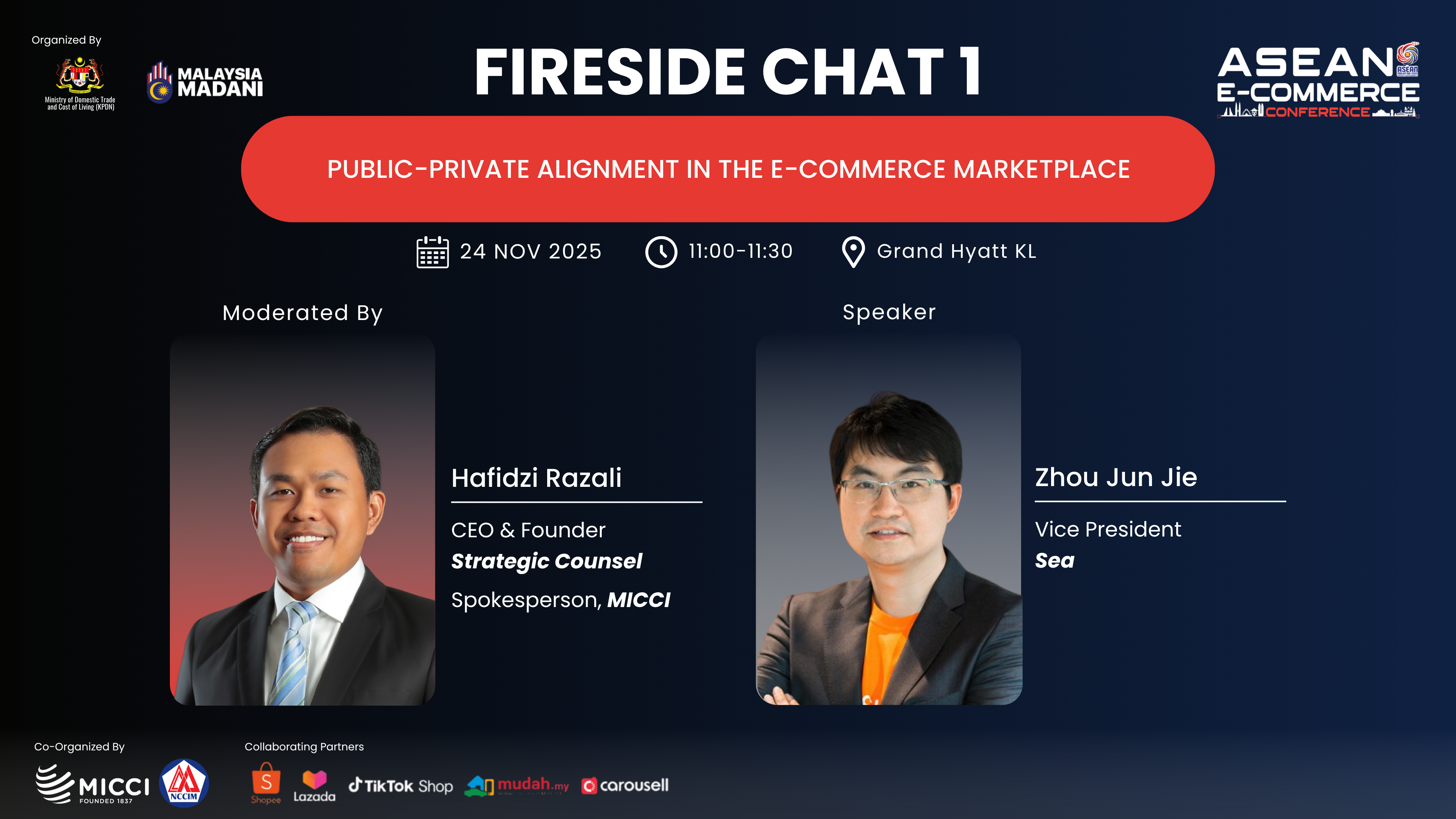 Moderated by Hafidzi Razali, Founder & CEO of Strategic Counsel and Spokesperson of MICCI, this focused conversation explores strategies for fostering long-term collaboration between public institutions and private platforms to unlock inclusive growth and build a unified regional digital ecosystem. With Zhou Jun Jie, Vice President of Sea, as expert speaker, attendees can expect candid insights, real-world perspectives, and actionable takeaways on building effective public-private partnerships that drive sustainable e-commerce growth across the region.